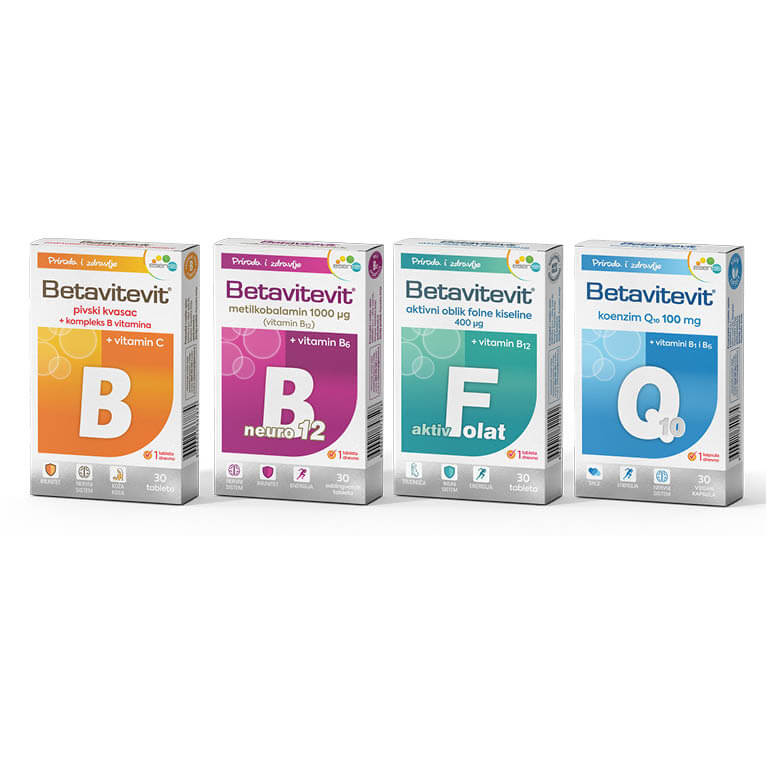 Betavitevit Aktiv folat, 30 tableta Betavitevit B kompleks, 30 tableta Betavitevit Neuro, B12 + B6, 30 tableta Betavitevit Q10, 30 kapsula